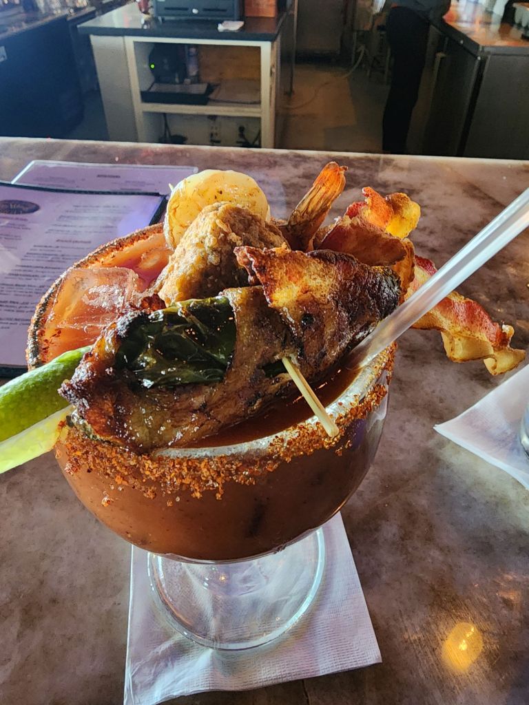 MOAB Bloody Mary – vodka, spicy tomato mix, jalapeño popper, grilled shrimp, fried boudin, bacon, celery, and spicy green sauce floater