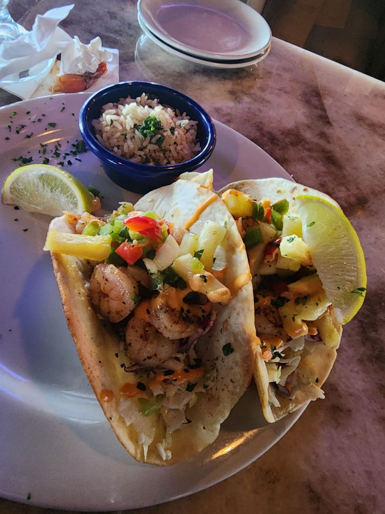 Lots of little grilled shrimp stuffed with slaw, pineapple pico and Sriracha aioli – 2 tacos super filling.
