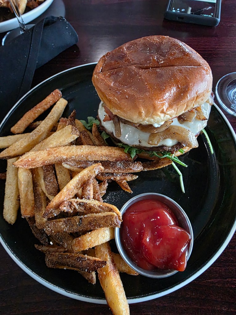 I had the House Burger – this is my favorite everything on this burger goes together SO GOOD! 8oz Burger, Provolone Cheese, Arugula, Crispy Prosciutto, Basil Aioli, Caramelized Onions, and Balsamic Tomatoes. I get this every time I go there its that good. French fries were really crispy and salty just perfect. MUST TRY