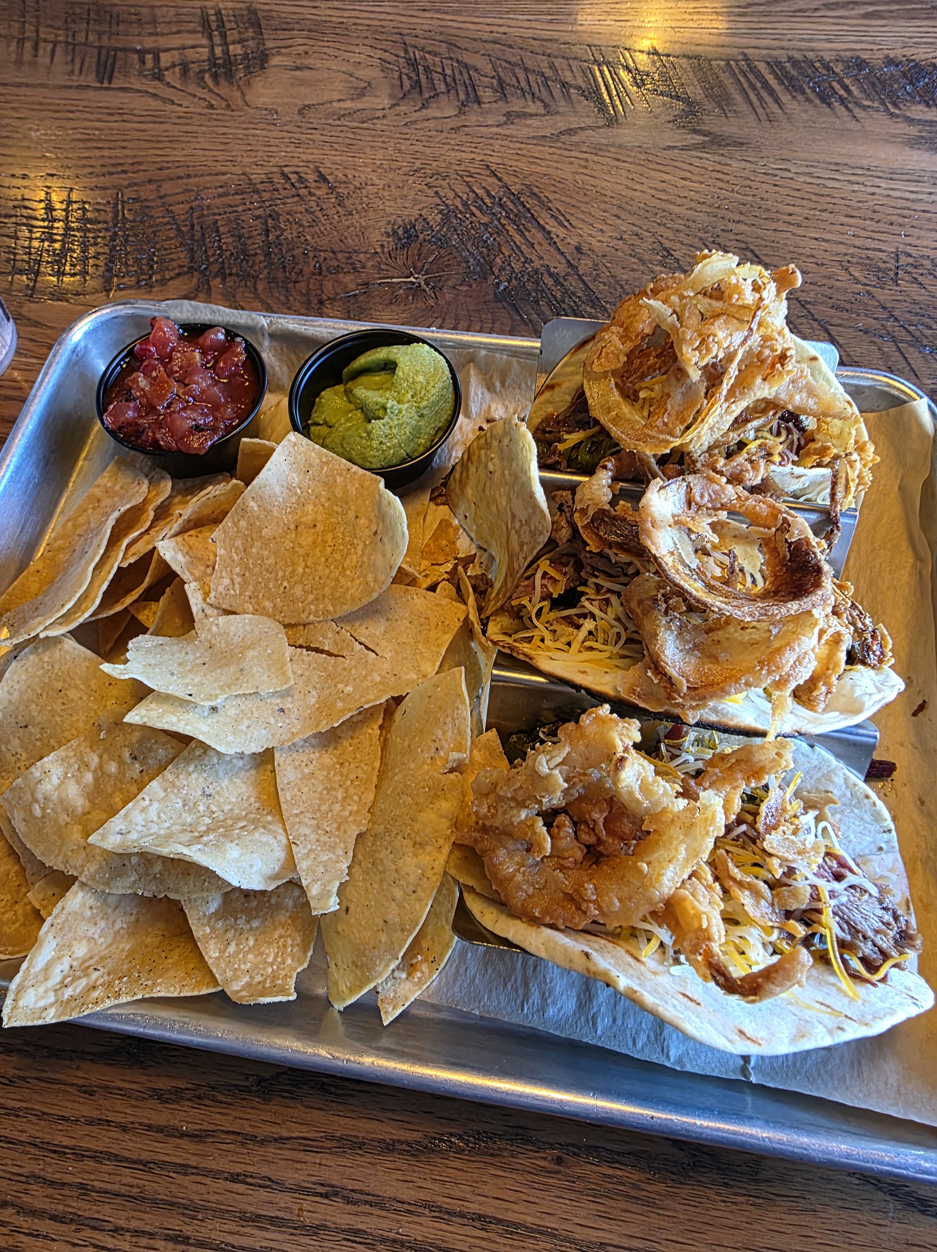 I got the Smokehouse Street Tacos – smoked brisket with charred jalapeno, crispy fried onions, cheddar, and raspberry chipotle drizzle. Everything is good at this place. Oh also cannot forget….ice cold latte draft.