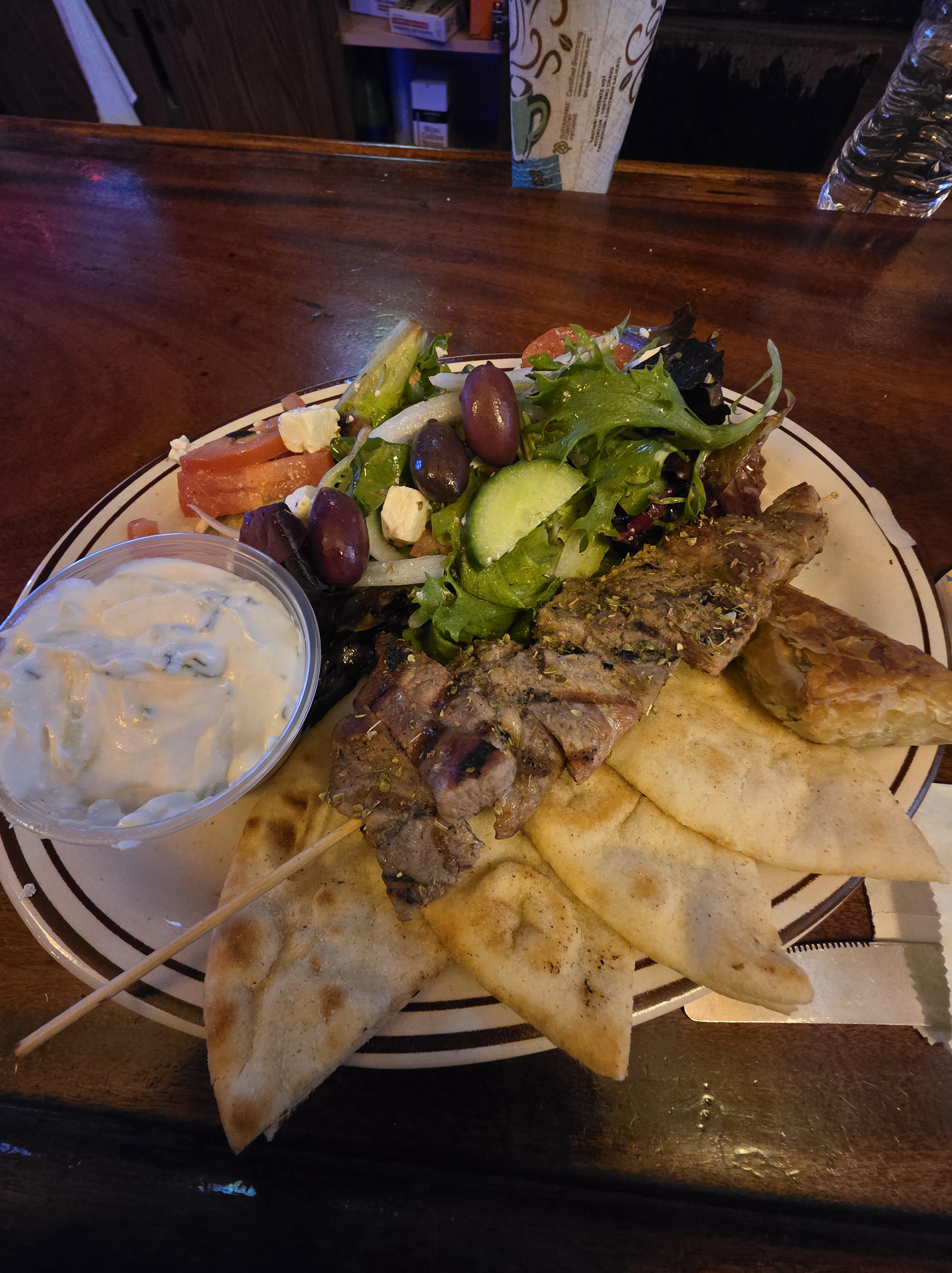 Souvlaki – Greek shish kabob with pita bread, Greek salad, and spanakopita. I can’t even remember what the hell Chris got because this was the shit. End of story…Μπράβο!